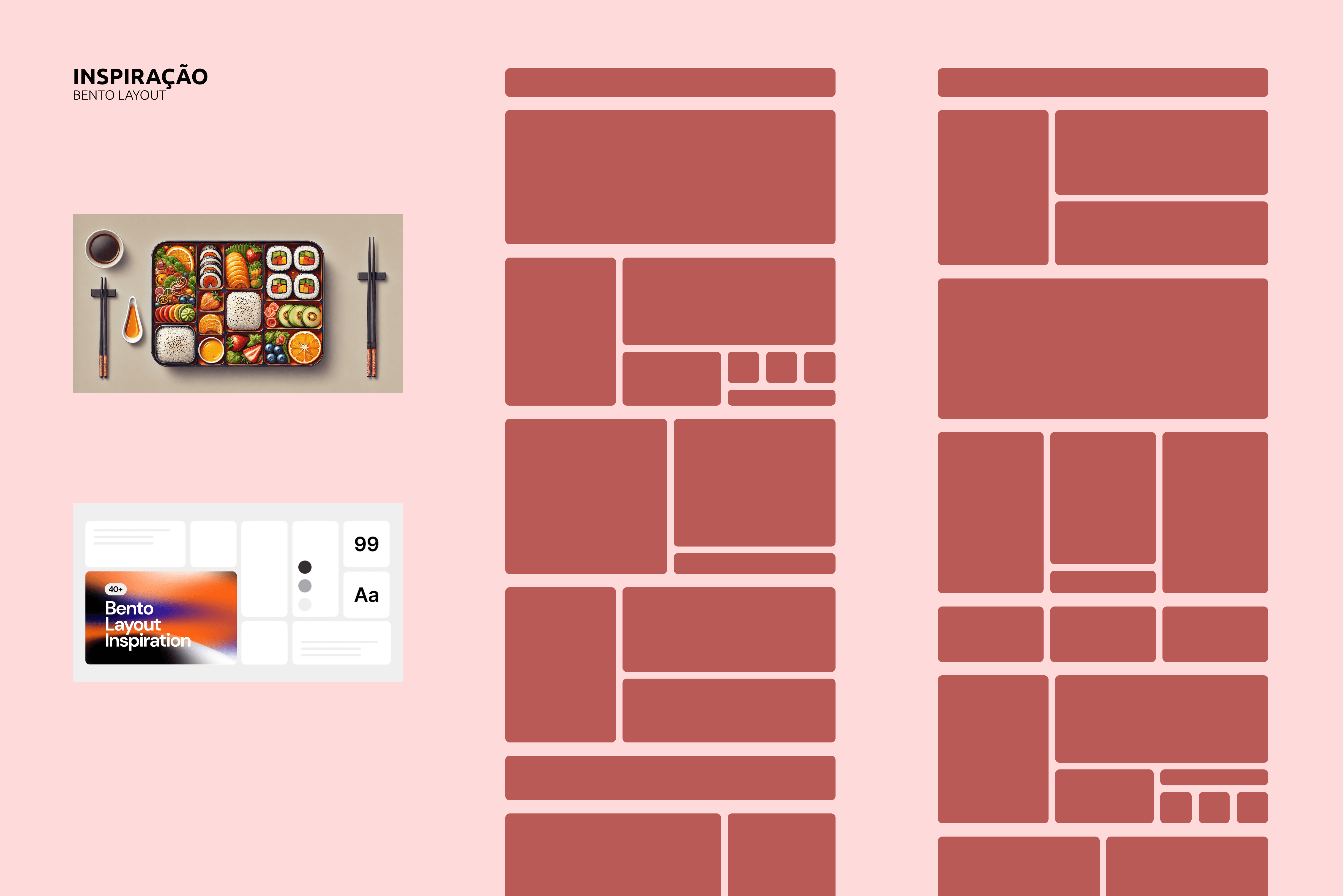 O conceito visual foi baseado no modelo Bento, utilizando blocos modulares para organizar o conteúdo, facilitar a navegação e estabelecer hierarquia clara.